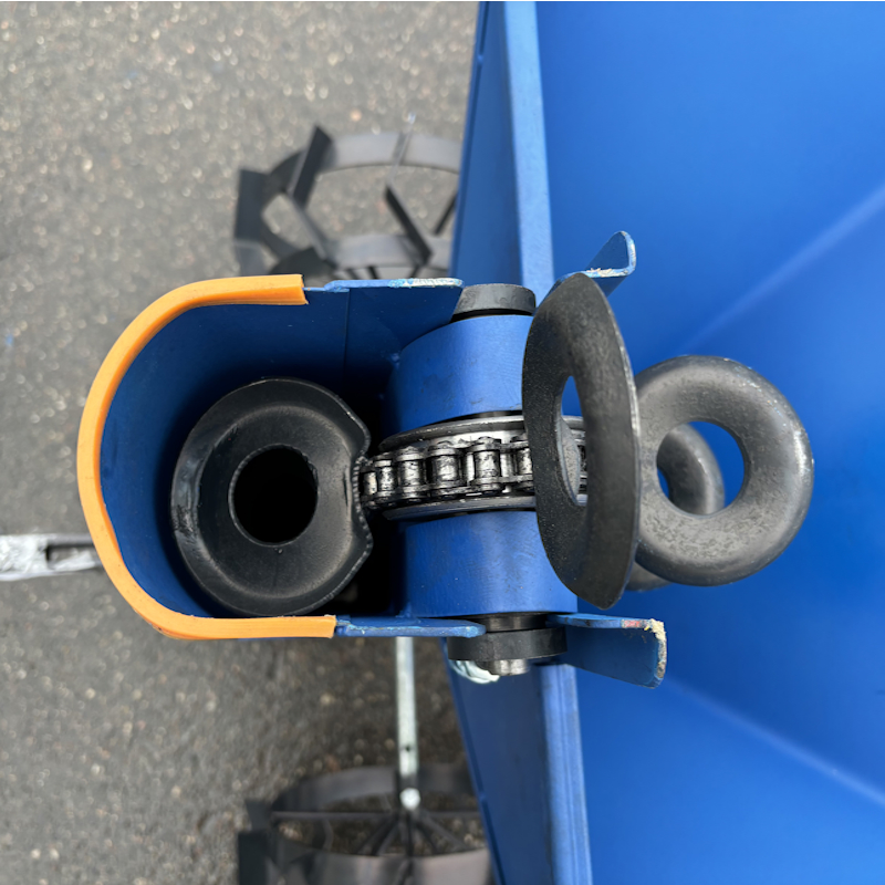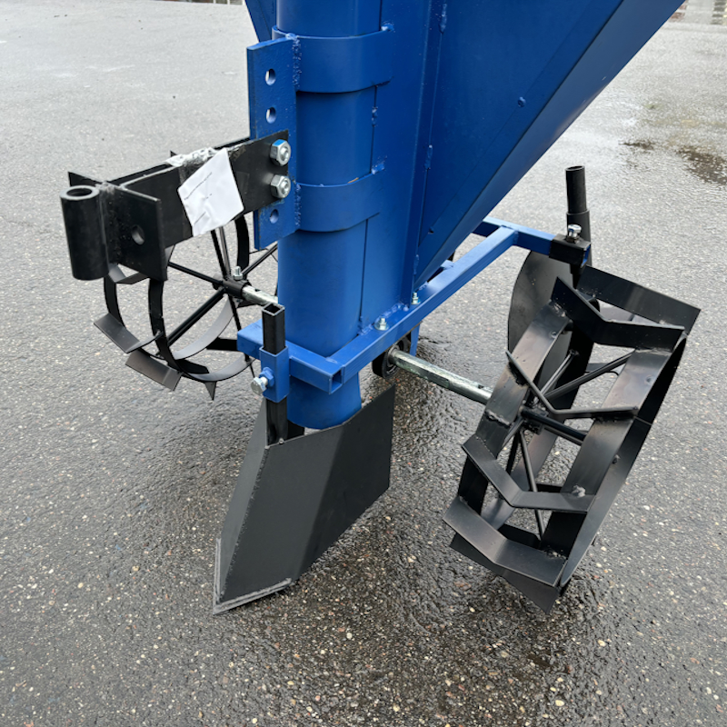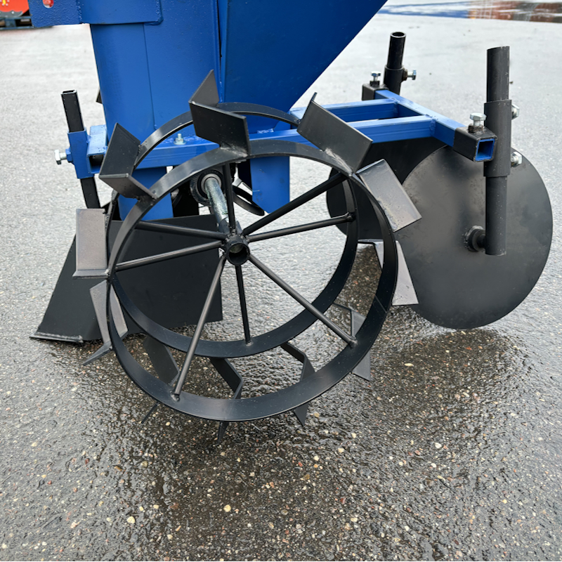 Бункер объемом 39 кг позволяет загружать достаточное количество картофеля для продолжительной работы без частой дозагрузки. Ширина междурядья регулируется от 51 до 60 см, а глубина обработки варьируется от 5 до 18 см, что обеспечивает универсальность при посадке на различных почвах. Расстояние между клубнями можно настроить на 22 или 27 см, поэтому посадка получается оптимально организована.