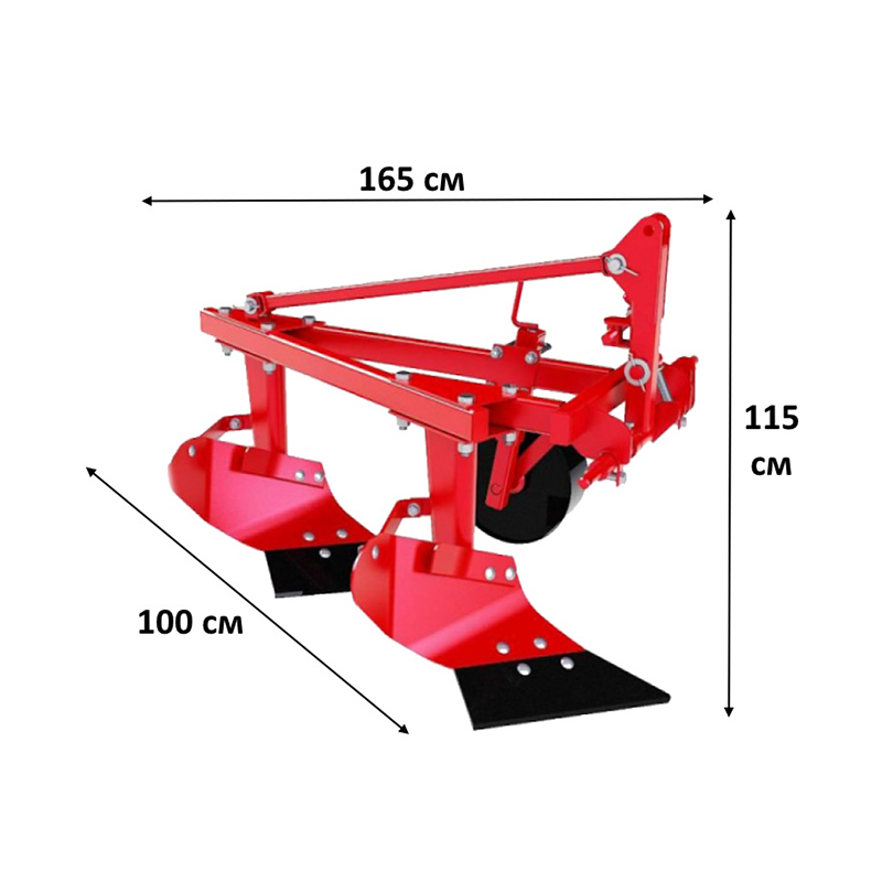 Габариты плуга составляют 165 см в длину, 100 см в ширину и 115 см в высоту, при весе 150 кг, что обеспечивает устойчивость и стабильную работу. Высота по стойке от пола до рамы 54,5 см. Усиленная конструкция делает его долговечным, а мощное крепление и конструктивные особенности позволяют использовать плуг на маленьких, средних и больших участках.