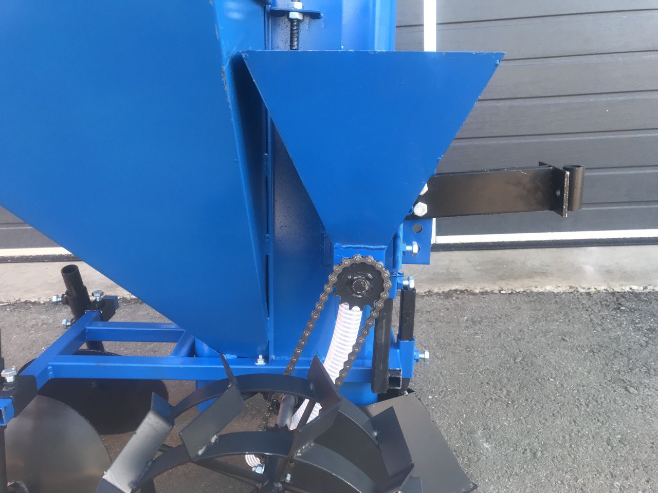 Объём бункера составляет 39 кг, что позволяет работать на больших участках без необходимости частой дозагрузки. Также сажалка оснащена дозатором для удобрений, объёмом 4 л. Регулируемая ширина междурядий от 52 до 60 см обеспечивает адаптацию к разным схемам посадки, а глубина обработки до 18 см гарантирует оптимальное размещение клубней. Расстояние между картофелинами можно настроить на 22 или 27 см для достижения наилучших условий роста.