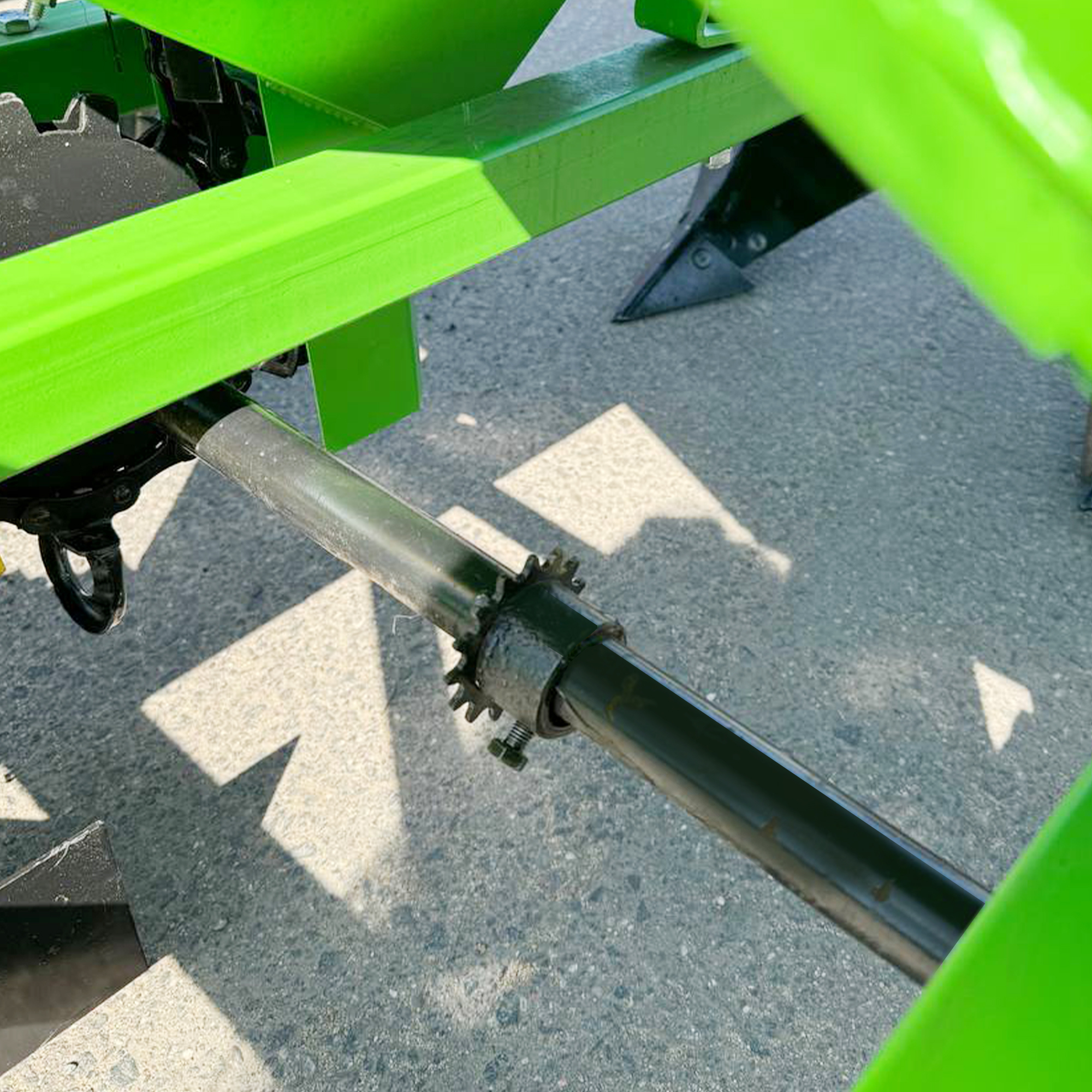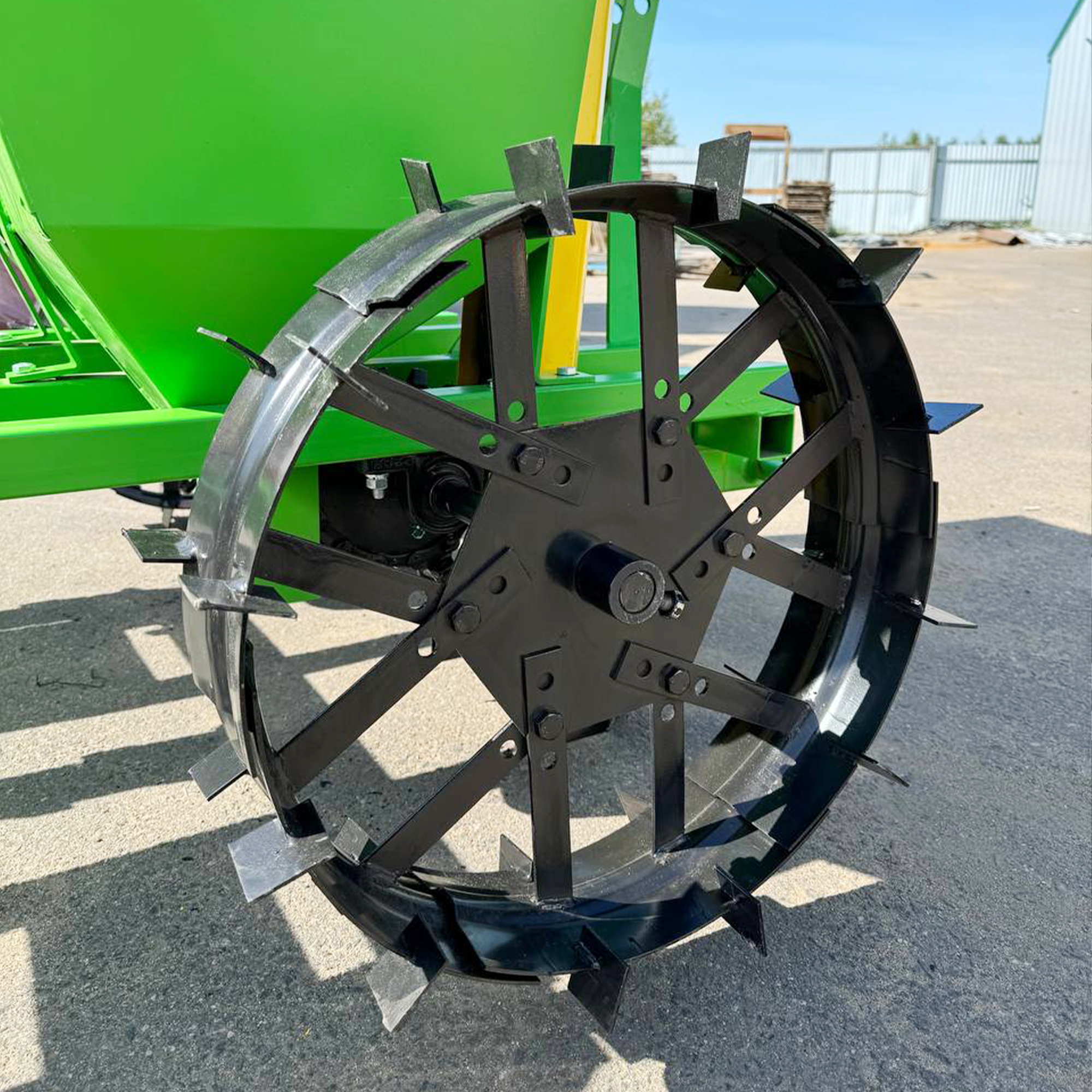 Бункер объемом 220 кг обеспечивает продолжительную работу без частой дозагрузки материала. Регулируемая ширина междурядий в диапазоне от 50 до 75 см позволяет адаптировать сажалку под различные виды полей и схемы посадки. Привод осуществляется от колес, поэтому оборудование простое в эксплуатации и надежное в работе.