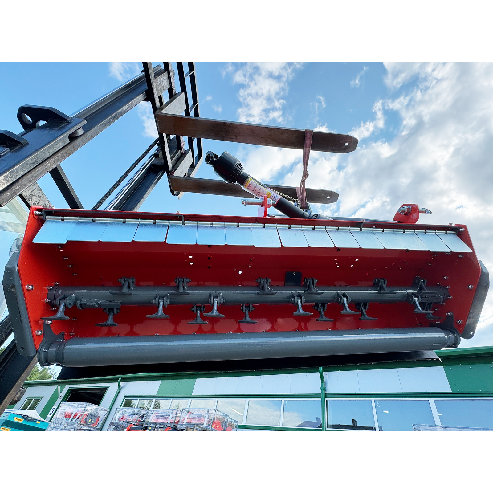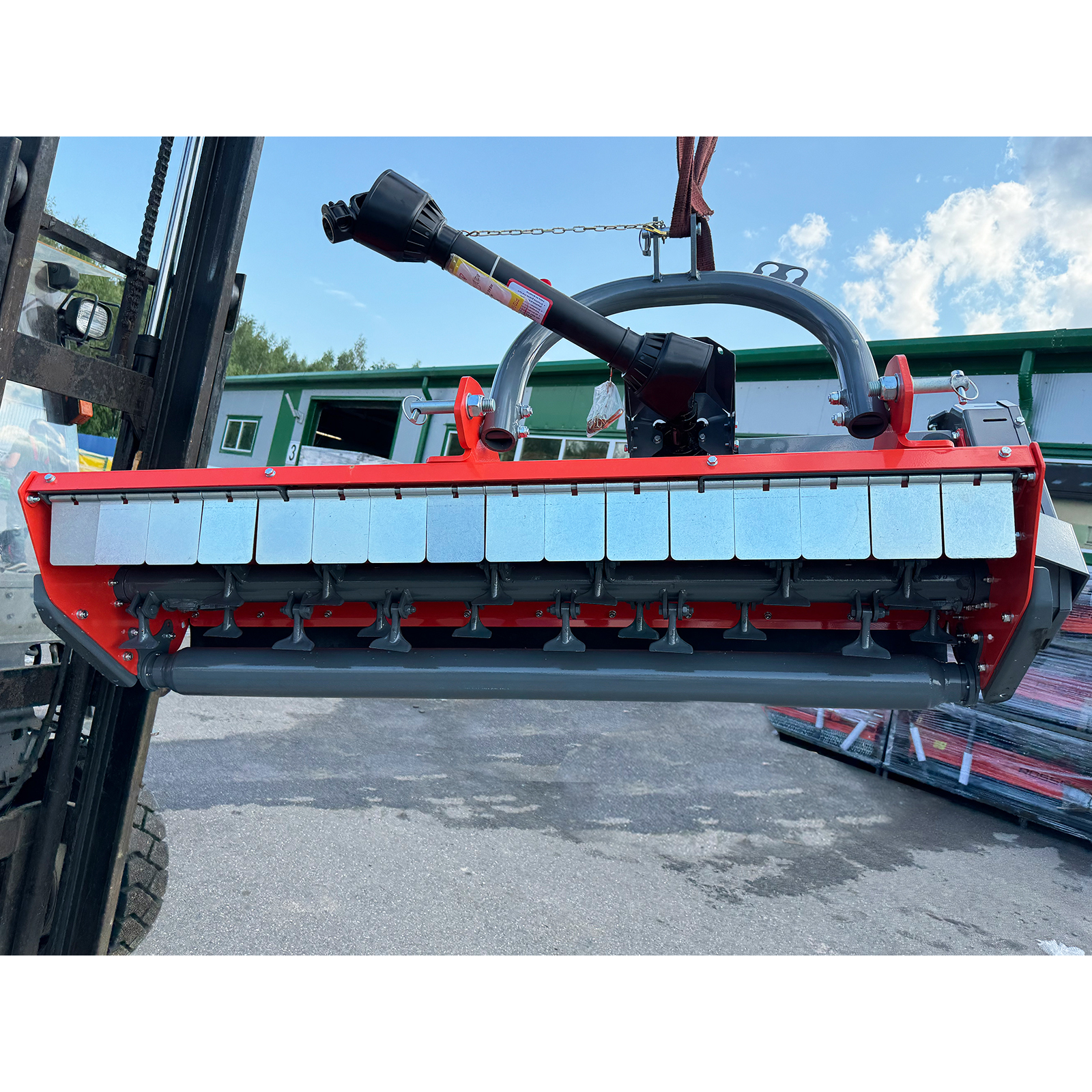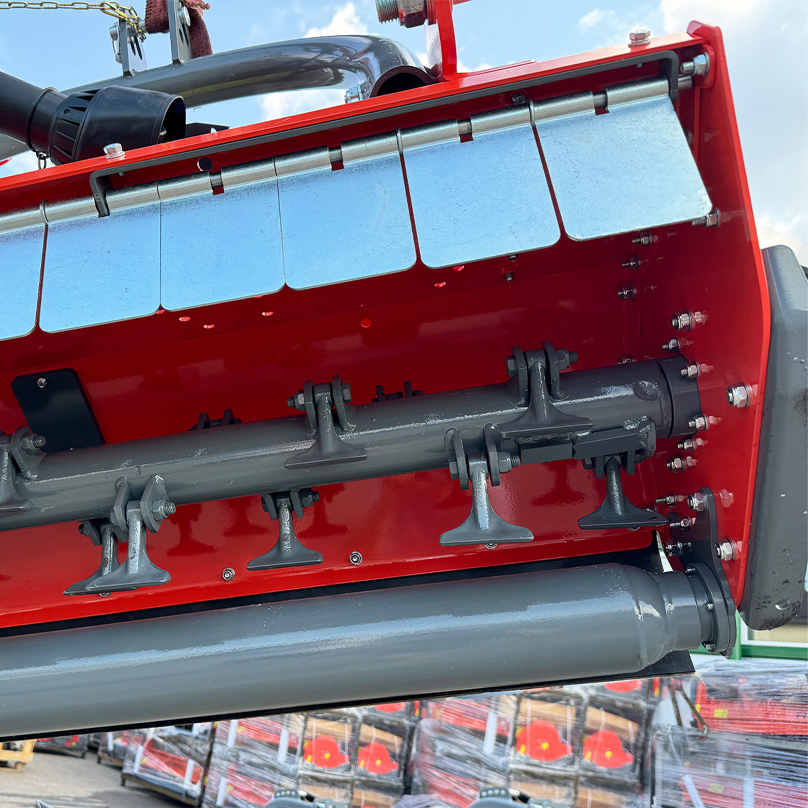 Стандартное оборудование включает 3-точечную навеску категории I, полозья, регулируемую высоту среза травы от 4 до 6 см, самоочищающийся выравнивающий ролик и приводной вал ВОМ. Кованые и закаленные молотковые ножи обеспечивают долговечность и высокую эффективность работы.