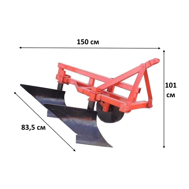 Конструкция плуга выполнена из высококачественной стали, что минимизирует риск деформации под нагрузкой и гарантирует долгий срок службы. Габариты плуга составляют 1500 x 835 x 1010 мм, а вес — 100 кг, что делает его удобным для транспортировки и хранения. Компактные размеры позволяют легко разместить оборудование на складе или в гараже.