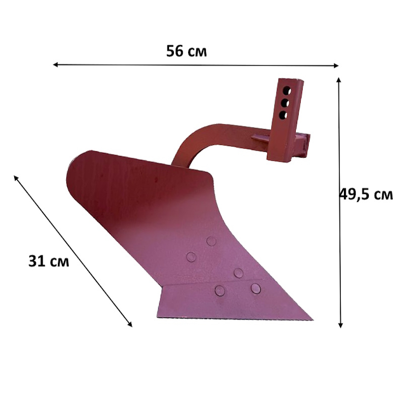 Плуг оборудован одним корпусом и крепится к мотоблоку при помощи специальной сцепки МТЗ (No6).Компактные размеры (56x31x49,5 см) и небольшой вес (13,4 кг) позволяют легко транспортировать и маневрировать плугом даже на небольших участках.