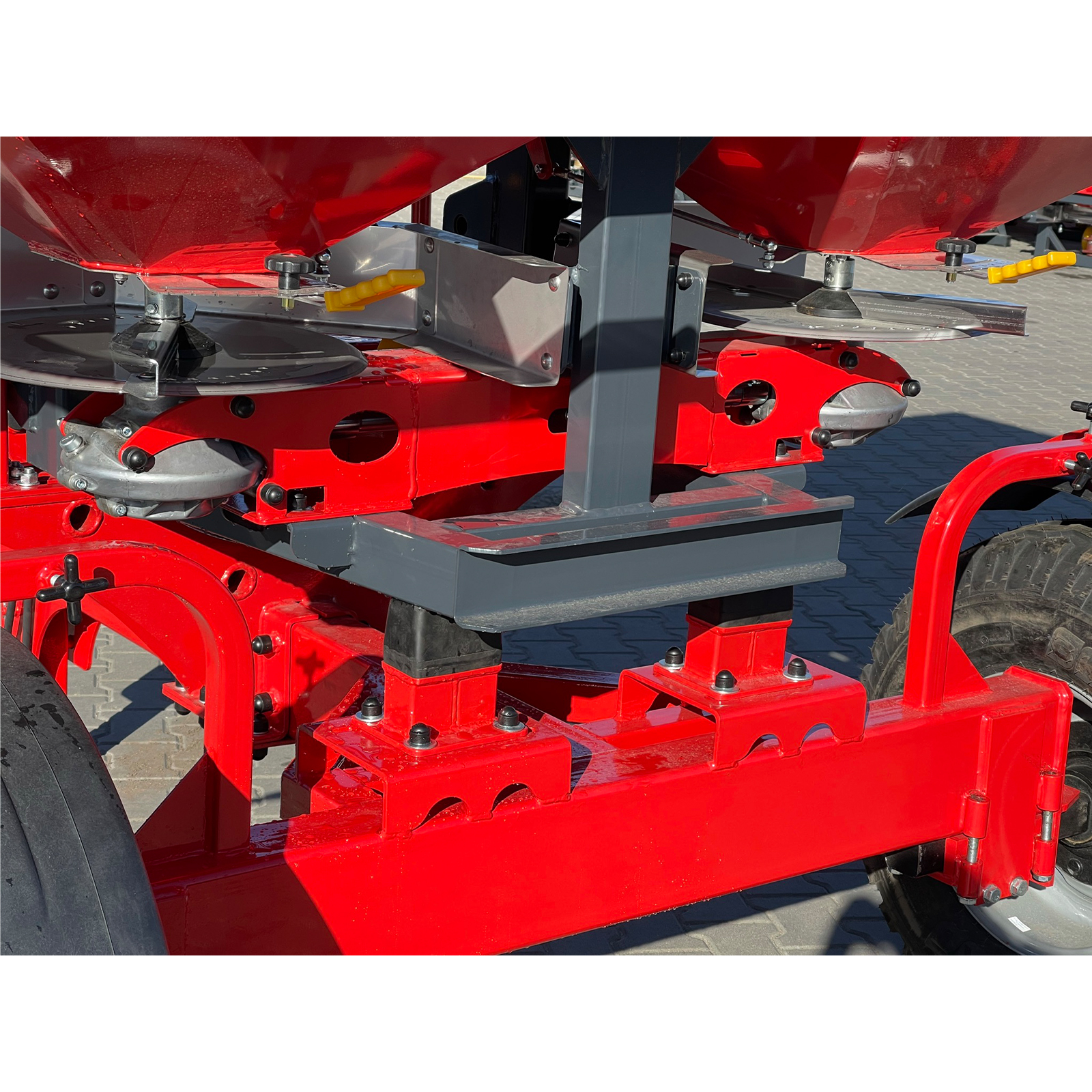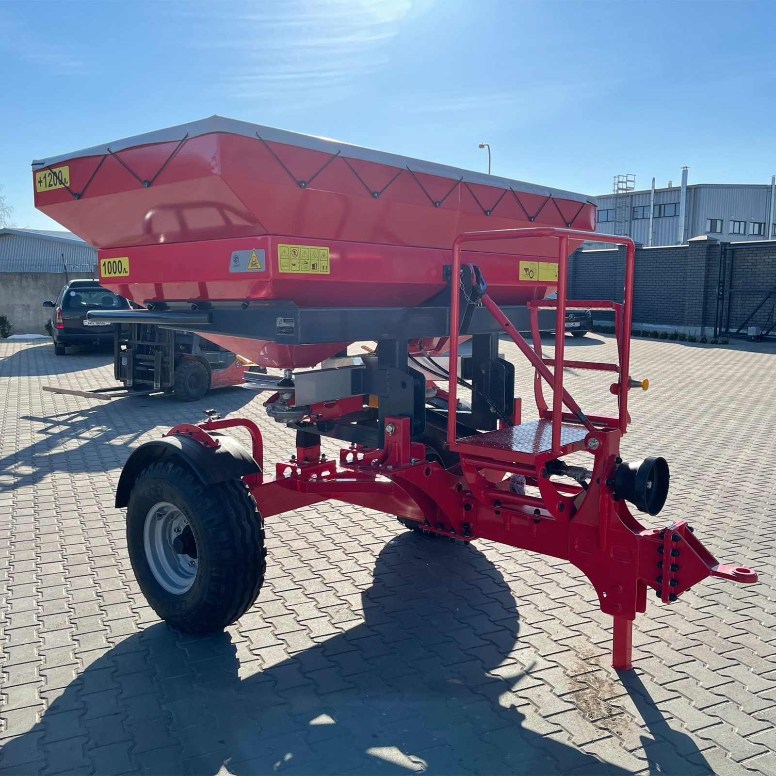 Оборудование оснащено гидравлическим механизмом включения и позволяет управлять им непосредственно из кабины трактора, без необходимости покидать рабочее место. Сетка в бункере предотвращает засорение дозатора комками удобрений, обеспечивая бесперебойную работу.