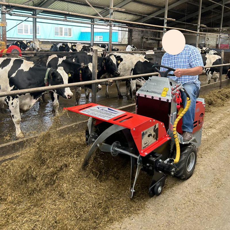 Шнек высотой 800 мм с защитным механизмом эффективно перемешивает корма, подталкивая их к кормовому столу, способствуя равномерному распределению. Открытая конструкция шнека повышает качество корма, смешивая его по ходу движения. Эластичная резиновая полоска внизу машины предотвращает загрязнение, улучшая гигиену кормления.