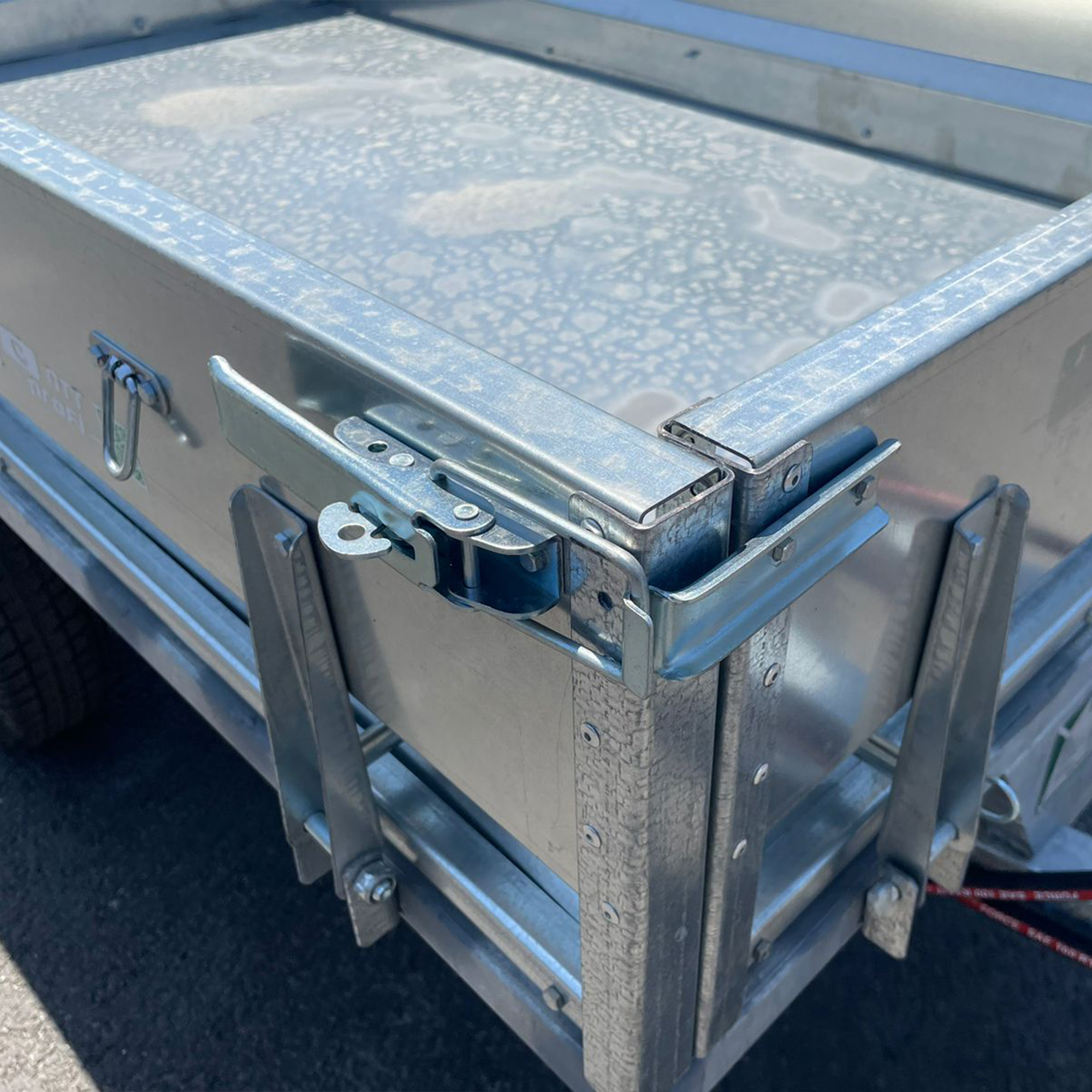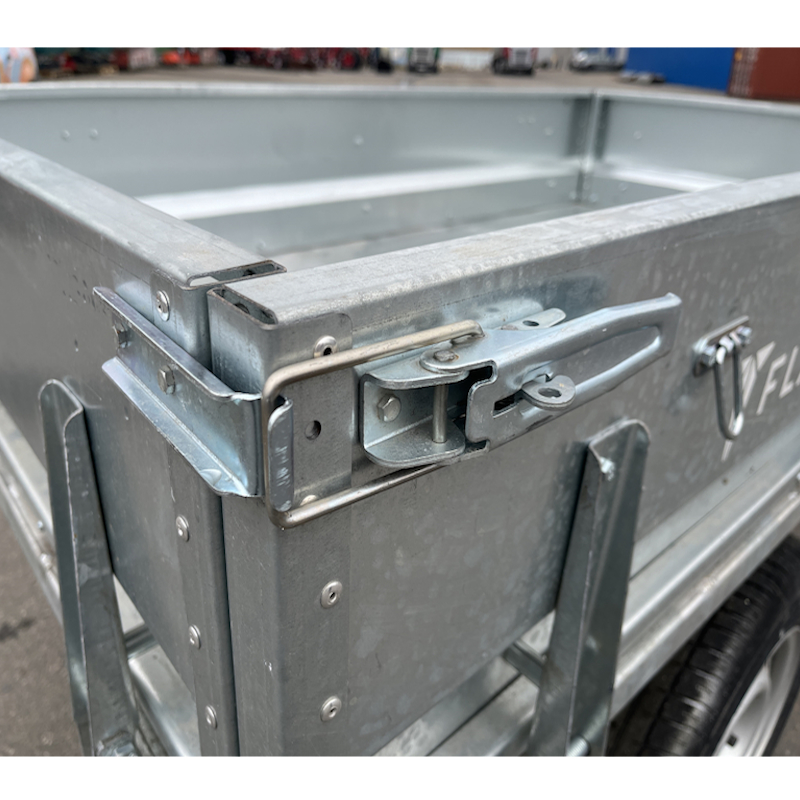 Размер кузова составляет 1935x1135x380 мм, объем 0,8 куб.м., что подходит для перевозки как сыпучих материалов, так и небольших предметов. Толщина бортов составляет 1,2 мм, а пола — 2 мм, что обеспечивает надежность и долговечность при эксплуатации. Для комфортного доступа к грузу, прицеп оснащен защелками. Боковые борта имеют петли для крепления груза или тента. В передней части предусмотрен страховочный фиксатор от случайного открытия.
