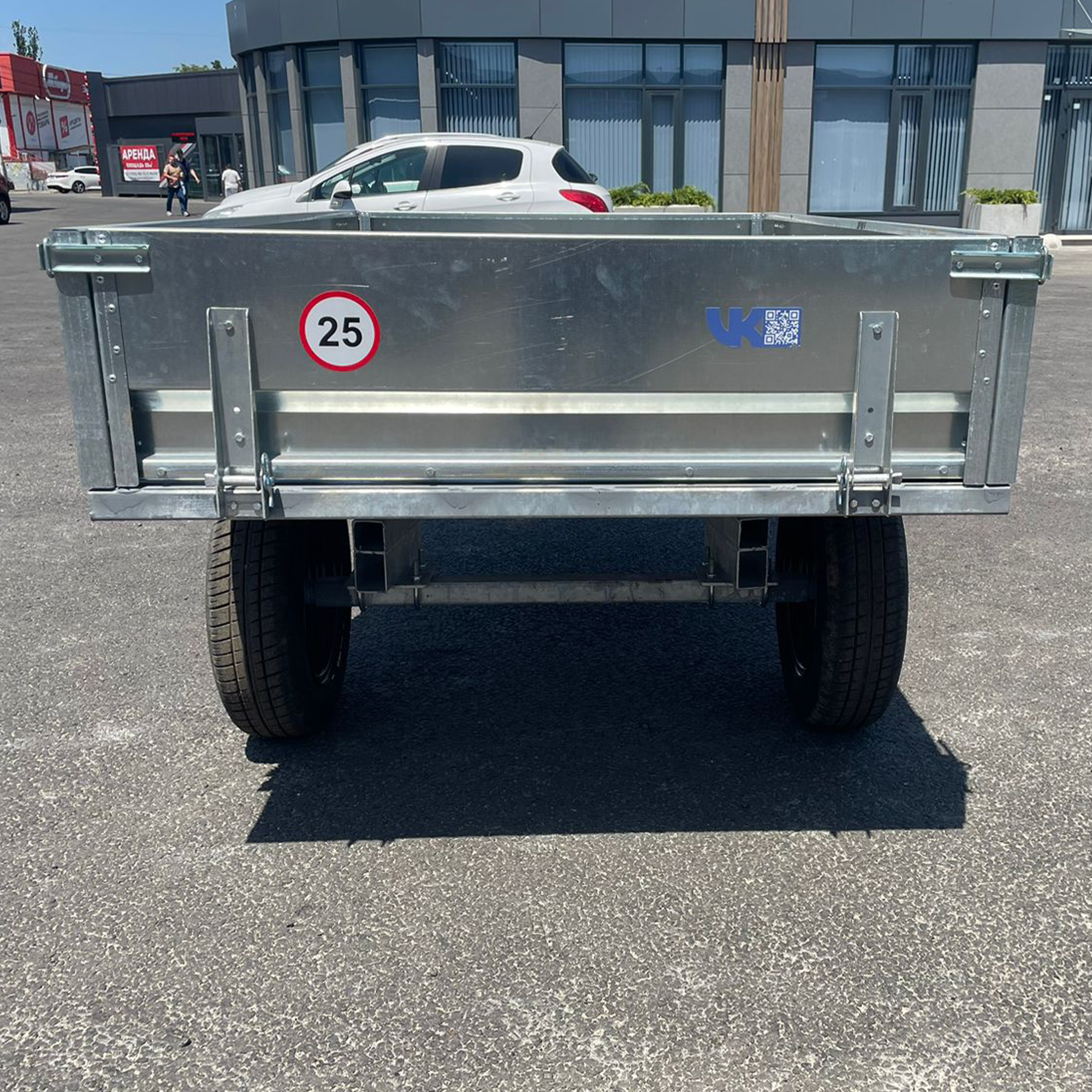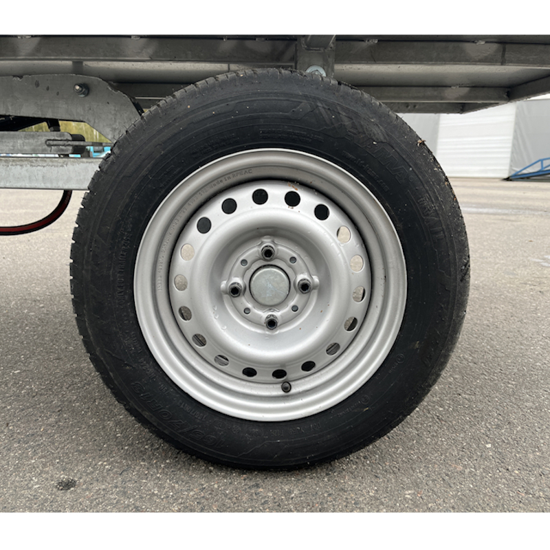 Прицеп оснащен прочными колесами размером 175/70 R13, что обеспечивает устойчивость и проходимость даже на неровной местности. Ширина колеи составляет 1060 мм, а клиренс в 25 см позволяет уверенно передвигаться по сельской местности и полевым дорогам.